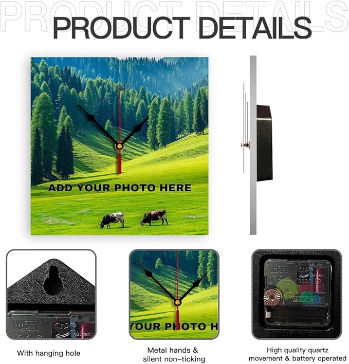 • ⏰⏰Personalized pictures clocks:Please click the“customize now“button at upper,upload your customized photo and add text.Stretch photo to fill the entire printing area.Submit high definition images for better print results.
