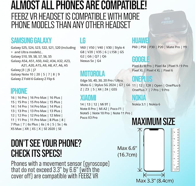 • Compatibility - Feebz VR headset for iPhone & Android model 2.0 fits more phone models than any other VR model.