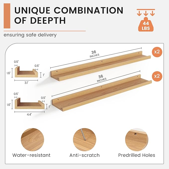 • 【Picture Ledge Perfect for Display】FLYJOE picture ledge shelves for wall turn your walls into a stunning photo gallery! These spacious shelves are ideal for showcasing a variety of picture frames in one secure place. With a thoughtful protective lip, you can display everything from photos to collectibles without worrying about them falling off