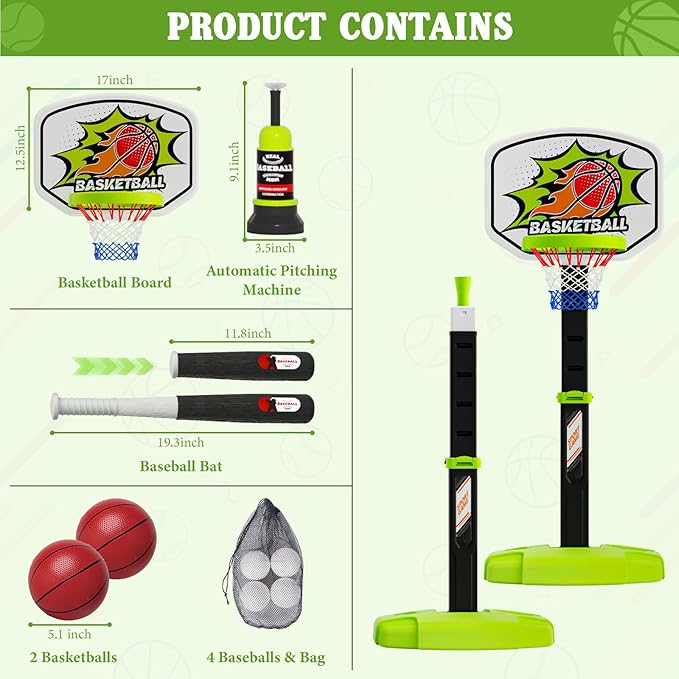 • 【3 WAYS TO PLAY】①Basketball Hoop: Equipped with 2 high-elastic basketballs to make playing basketball more fun. ②Baseball Tee Stand: Ideal for helping kids practice batting skills and improve hand-eye coordination. ③T Ball Automatic Launcher: Baseball bounces automatically and hits the baseball quickly, making the game challenging and fun