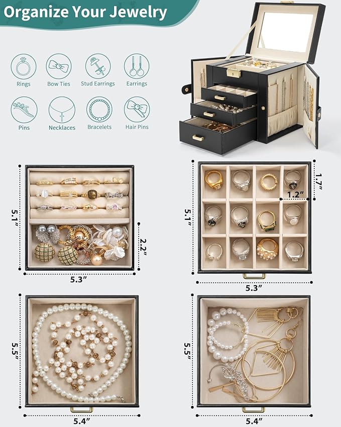 AKOZLIN 4-Tier Jewelry Box Leather Jewelry Storage Organizer with 3 Drawers Lockable for Women Girls Ring Necklace Earring Bracelet Holder with Mirror Black