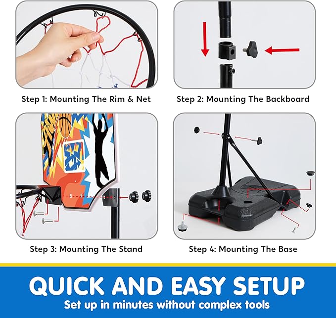 • Easy Assembly: The children's basketball set includes 4 inflatable basketballs, a pump, a basketball hoop, and other assembly accessories. The design is simple and easy to understand, making it quick to assemble and disassemble, perfect for children aged 3 to 8.