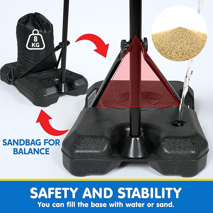 • Sturdy and Stable Design: The basketball set features a triangular base and support stand for enhanced stability. The base can be filled with water or sand to ensure stability during use. Suitable for both indoor and outdoor use, it is an ideal choice for active toddlers.
