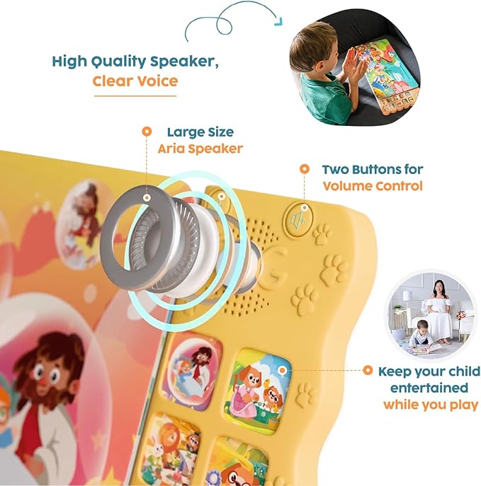 • 2 volume control buttons allow easy adjustment of volume: Joyful bible songs for young hearts: This interactive sound book introduces little ones to Jesus’ teachings and Bible proverbs through colorful illustrations and joyful songs, making it ideal for family bonding and as a thoughtful gift for Christmas, Baptisms, Easter, and more.