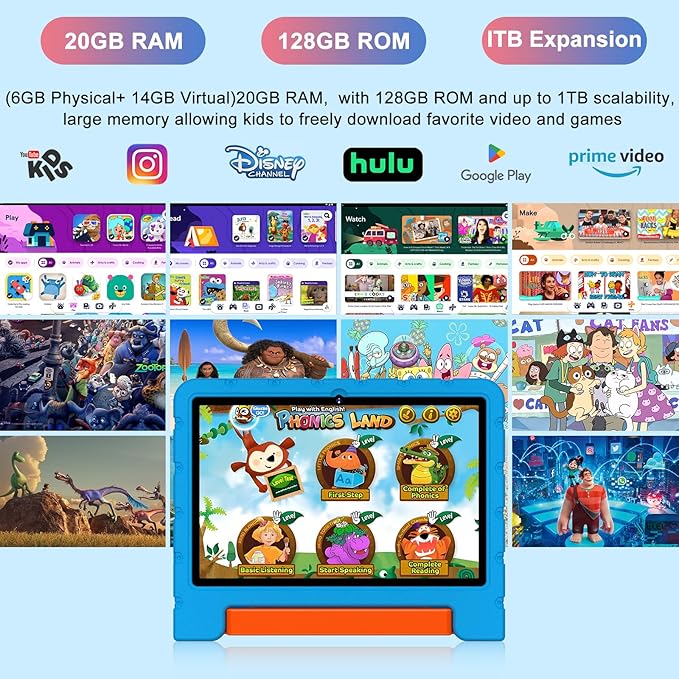 • 【20GB (6+14) RAM and 128GB Super ROM & 6000mAh Large Capacity Battery】 20GB ( 6GB Original + 14GB Expanded Virtual ) RAM + 128GB ROM (SD card expandable up to 1TB), it is able to run various apps compatibly and smoothly, and store your child's favorite movies, photos and apps, such as Kindle,Instagram,Disney+ and other daily required apps directly from the pre-installed play store to meet your child's diverse learning and entertainment needs. Let kids enjoy math, language, music, painting in the game. Equipped with a large 6000mAh battery, giving your child a stable and continuous use experience.