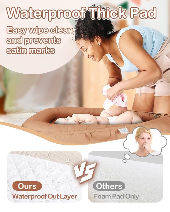 • 🌜[𝑩𝒓𝒆𝒂𝒕𝒉𝒂𝒃𝒍𝒆 π‘­π’‚π’ƒπ’“π’Šπ’„ 𝒇𝒐𝒓 π‘Ίπ’‚π’‡π’†π’•π’š 𝒂𝒏𝒅 π‘ͺπ’π’Žπ’‡π’π’“π’•] The lounger features breathable cotton fabric as the cover, super soft and breathable polyester fiberfill for the bumper filling, and 3D breathable polyester for the mat filling. It adopts a bionic design to imitate mom's comfy womb, providing a comfortable and soothing environment for the baby. The baby lounger is approved by CPC and CPSIA. All of our newborn lounger covers are manufactured under strict supervision by a meticulous quality control team to ensure that the lounger covers meet all standards.