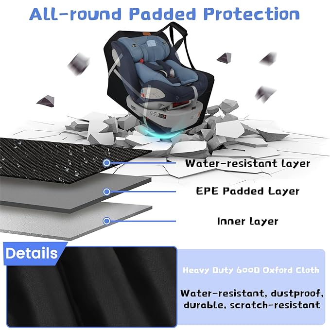 • Premium Quality: Made from heavy duty, water resistant polyester fabric, travel car seat covers for babies is easy to clean. With thick 5 Protective Bumper Feet on the bottom, padded car seat travel bag provides complete scratches protection. Car seat check bag protects baby;infant;toddler carseats from dirt, keeping baby products clean and healthy. Dual lockable zipper opening improves safety