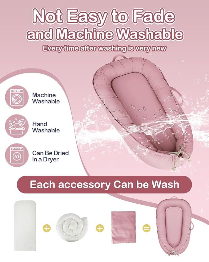 • 🌜[𝑩𝒓𝒆𝒂𝒕𝒉𝒂𝒃𝒍𝒆 π‘­π’‚π’ƒπ’“π’Šπ’„ 𝒇𝒐𝒓 π‘Ίπ’‚π’‡π’†π’•π’š 𝒂𝒏𝒅 π‘ͺπ’π’Žπ’‡π’π’“π’•] The lounger features breathable cotton fabric as the cover, super soft and breathable polyester fiberfill for the bumper filling, and 3D breathable polyester for the mat filling. It adopts a bionic design to imitate mom's comfy womb, providing a comfortable and soothing environment for the baby. The baby lounger is approved by CPC and CPSIA. All of our newborn lounger covers are manufactured under strict supervision by a meticulous quality control team to ensure that the lounger covers meet all standards.
