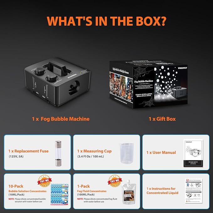 • 【High Output 5000+ Fog Bubbles】Fog Filled Bubbles Machine Can Generate More Than 5000+ Bubbles Per Minute with Super Built-in Motor. It Can Blow Tons of Colorful Bubbles or Amazing Foggy Bubbles Faster, Higher and Farther Even Inside with No Wind