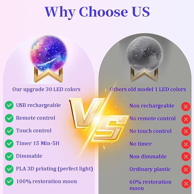 • 2025 Upgrade- We have added a charging function. When it is out of power, you can use a Type-C charging cable to charge it. And we have also added a remote control. You can use the remote control to switch 30 different light colors, and you can also use the remote control to set the timer function for 15 minutes -30 minutes -45 minutes -1 hour -2 hours -5 hours. Touch the metal ring of the moon lamp charging port to switch between 7 different light colors. It is so convenient.