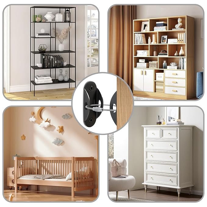 • 【MULTIPLE FURNITURE APPLICATION】 :Furniture Wall Anchor can be used on various types of furniture, such as wardrobes, bookcases, TV cabinets, vanity tables, drawers, cabinets, bookshelves, and any kids furniture. The widespread use of this metal wall anchor can prevent unnecessary harm to infants and young children, creating a safe environment for your child.