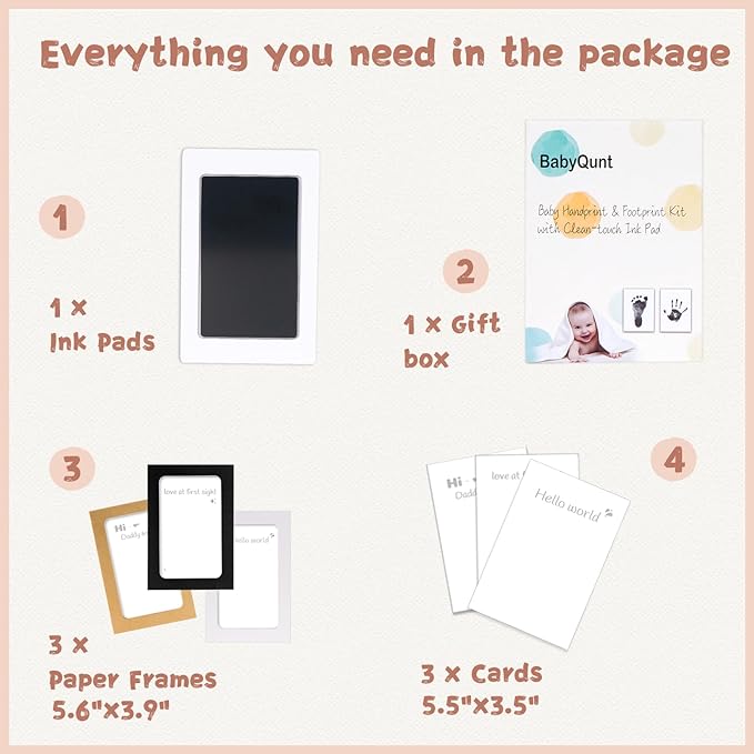 • 【Product Details】: Our baby hand and footprint kit measures 5.0"x3.2" with an ink window of 3.7"x2.3", which is the best size for recording hand and footprints of newborns 0-6 months old or pet paw prints . The ink pad for baby hand and footprints includes 1 clean touch ink pads, 3 stamping cards, and 3 display frames, ensuring you have ample opportunity to capture the best stamp.