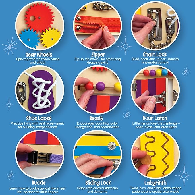• Builds Skills Through Play - This toddler busy board is thoughtfully designed as a Montessori play board that helps develop fine motor skills, sensory awareness, and early independence. With zippers, latches, and a shoelace panel, this sensory board builds real-life coordination through fun hands-on activities.