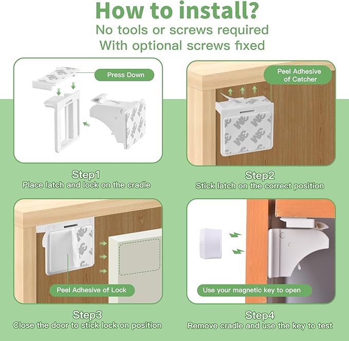 • [ 6 LOCKS + 2 KEYS ] Vkania magnetic cabinet locks are perfect for baby proofing cabinets and drawers. These child proof cabinet locks feature a strong magnetic design to keep curious toddlers and pets out. Easy to install with 3M adhesive—no tools, drilling, or holes required. Ideal for baby safety locks for cabinets in kitchens, bathrooms, and more.