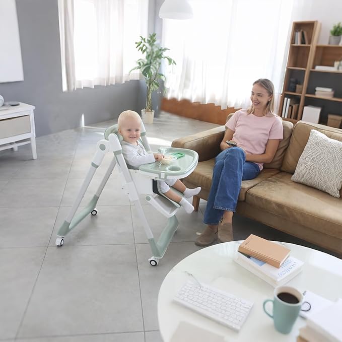 • Portable & Compact: Featuring lockable wheels for easy mobility, this high chair folds flat for convenient storage. It's ideal for city living, apartments, and small spaces, helping you keep your home organized and clutter-free