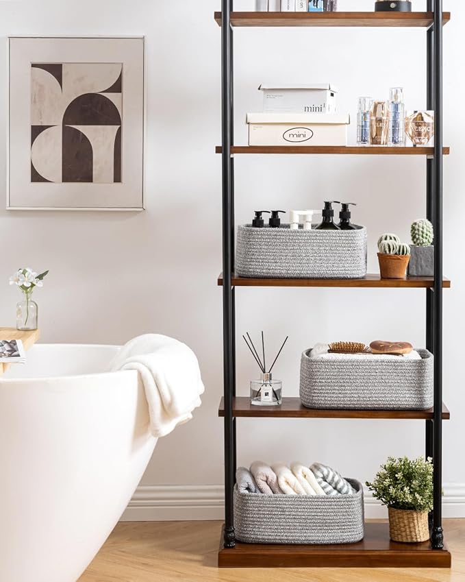 • [ Elegantly Designed to Match Any Dรฉcor ] Our small rope basket creates a minimalist appearance, and it adds a touch of warmth and texture to any room. The classic solid color design ensures seamless integration with your existing aesthetics, complementing any decoration. Perfect as decorative storage baskets for shelves, cabinets, and any open display space, making them a stylish and practical addition to any decor, enhancing the overall aesthetics of your room