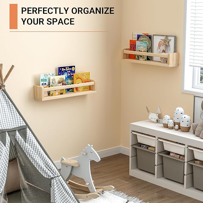 Heimlove Nursery Floating Shelves, Wood Nursery Book Shelves for Wall, 16 inch Wall Bookshelf for Kids Solid Wood Wall Mounted Shelves for Books,Toys and Decor Storage, Set of 2