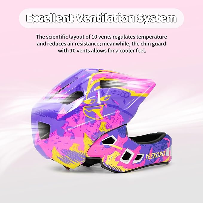 • FULL FACE PROTECTION SYSTEM: YEEKORO children's full face bike helmet is a unique blend of hard ABS shell and advanced EPS crash-proof material, with well-designed chin protection, which together builds a multiple defense system. Whether riding off-road or on the highway, your child will be provided with comprehensive safety protection, effectively resisting injuries caused by strong impacts and guarding every moment of adventure