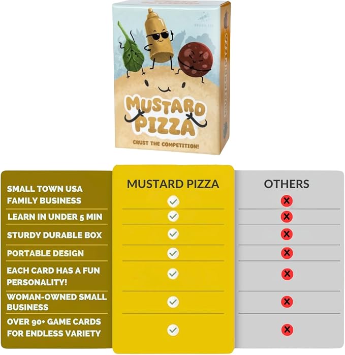 • PIZZA MAYHEM AWAITS! - Mustard Pizza is a fast-paced family card game where players race to craft the ultimate pizza with a mix of ingredients and action-packed twists! Compete to build the ultimate pie with wild toppings and unexpected twists in every turn!