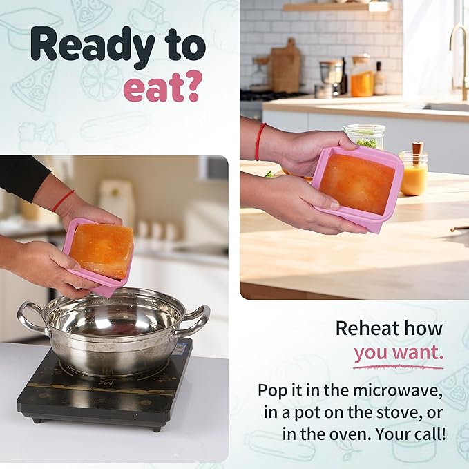 • VERSATILE & CONVENIENT FOR ANY KITCHEN TASK Use them for: Freezing homemade soups, sauces, and broths Storing baby food and portioning snacks Baking (up to 415°F without the lid) Making ice cubes, chocolates, and more! Dishwasher-safe for quick and easy cleaning, they save you time in the kitchen.