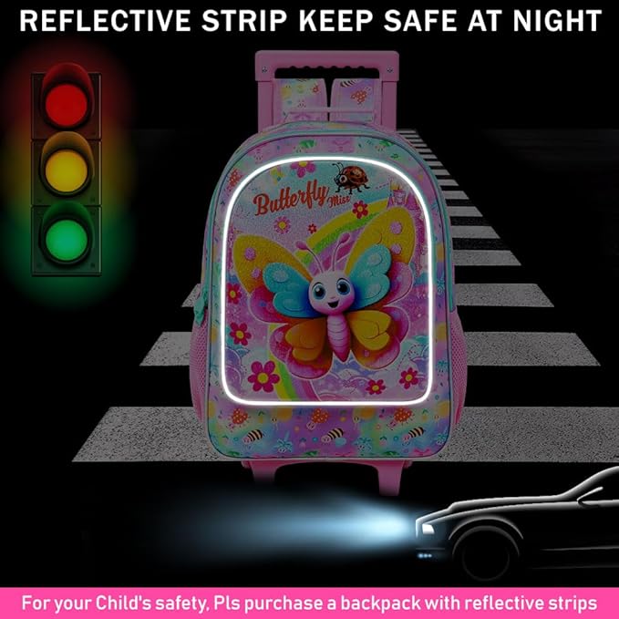 • Butterfly Rolling Backpack Details: Reinforced side mesh pockets and strap links, padded and breathable shoulder straps, smooth double zipps, these designs make the kids roller backpack for girls more durable.