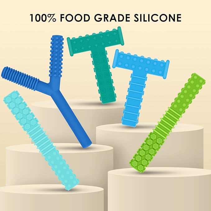 • FUN TEETHING TOYS: Our sensory teething toys set includes 2 pcs T shaped, 1pcs Y shaped sensory chewy toys and 2 pcs teething tubes, helps keep your kids from chewing on fingers, pencils, hands, clothes, hairs, etc. Reducing stress, anxiety especially when they need to soothe, calm, or focus