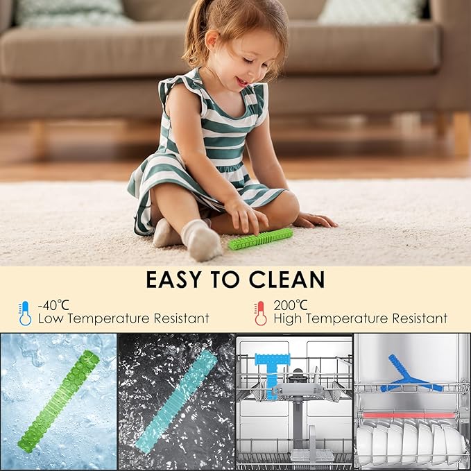 • EASY TO CLEAN: very easy to clean, just wash the sensory chewing toys with soapy water, or wash it with dishwasher. Our teethers for babies can be sterilized by boiling water, steam sterilizer and sunlight. -40โ„ƒ to 200โ„ƒ Temperature resistant, we suggest cleaning it before first use and after each use