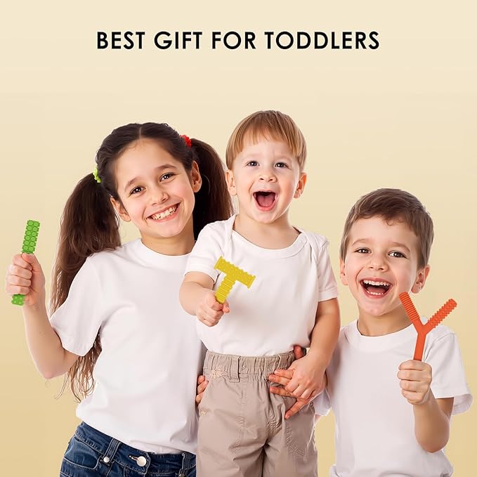 • FUN TEETHING TOYS: Our toddler teething toys set includes 1 pcs T shaped, 1 pcs Y shaped sensory chewy toys and 2 pcs teething tubes, helps keep your kids from chewing on fingers, pencils, hands, clothes, hairs, etc. Reducing stress, anxiety especially when they need to soothe, calm, or focus