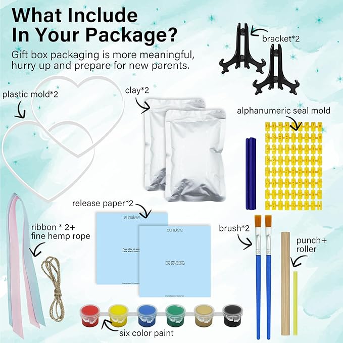 • Handprint Set:The Handprint set consists of soft, baby-safe clay that is easy to use - there is no need to mix or bake, just press your baby's hand or foot into the clay to form an imprint and allow air to dry to form a detailed impression.