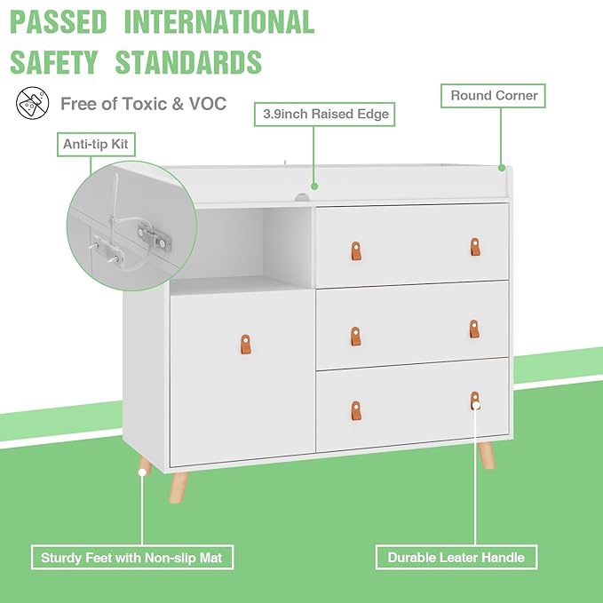 • Easy Assembly: Professionally tested and exceeding safety standards, our changing table dresser comes with an anti-tip kit to reduce the risk of furniture tipping over for children aged 5 and below. Assembly is a breeze with our comprehensive instructions.