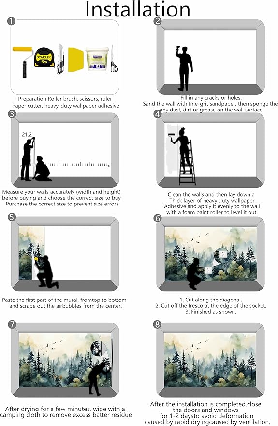 • Installation Steps1. Fill in any cracks or holes and clean the surface of the wall of dust, dirt and grease.2. Apply heavy-duty wallpaper paste to the wall, not the mural.3. Mark the position of each strip of wallpaper with a spirit level.4. Align the pattern and slide it into place.5. Scrape the bubbles with a spatula.6. Let it dry for a couple of minutes and it's ready to go!