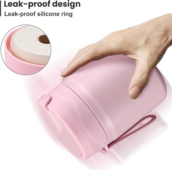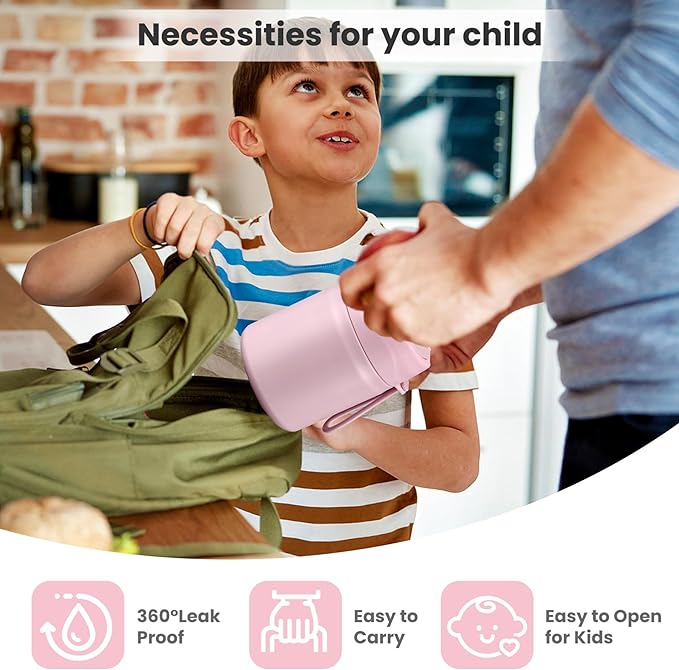 • Leak-Proof Design: Featuring an upgraded double-layer silicone seal that provides a 360ยฐ leak-proof guarantee. Rest assured that our leak-proof thermo food jar can fit in your lunch bag without worrying about spills. The insulated thermal food jar comes with a stainless steel spoon for your child's convenience.