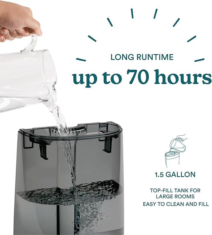 • Top-Fill Tank: Easy to fill and clean; 1.5-gallon water tank provides up to 70 hours of runtime based on mist setting; Clean Tank Technology helps protect the tank from mold and mildew; automatically shuts off when out of water; ideal for large family rooms and bedrooms up to 502 sq. ft