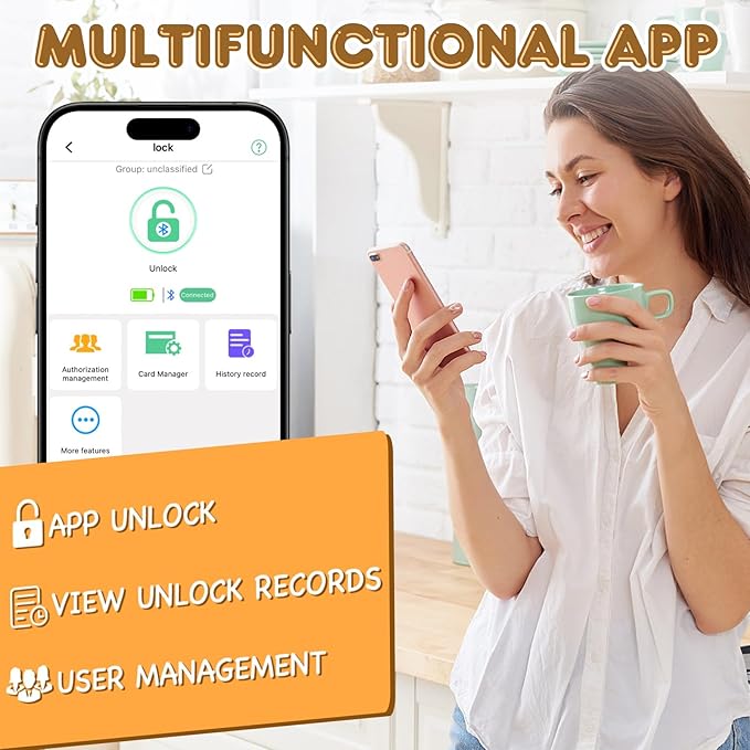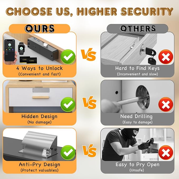 • 🔓【Multi-Access Options】Seamlessly unlock your cabinet with the app, RFID card, or via NFC and supports iwatch unlock for ultimate convenience, eliminating the need for keys and passwords.