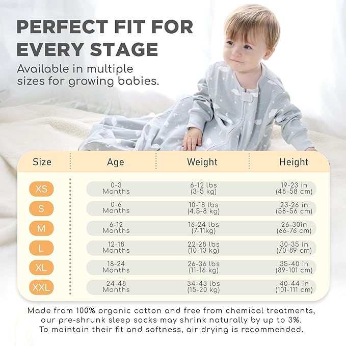 • 【PERFECT FIT FOR YOUR GROWING BABY】— To keep them comfortable & safe as they transition from newborns to curious adventurers, we created 4 different sizes of wearable blankets — Small sleeping sacks for 0-6 months babies, 10-18 lbs, Medium sleeping sacks for 6-12 months babies, 16-24 lbs, Large sleep sacks for 12-18 months babies, 22-28 lbs, & X-Large sleep sacks for 18-24 months babies, 26-36 lbs.