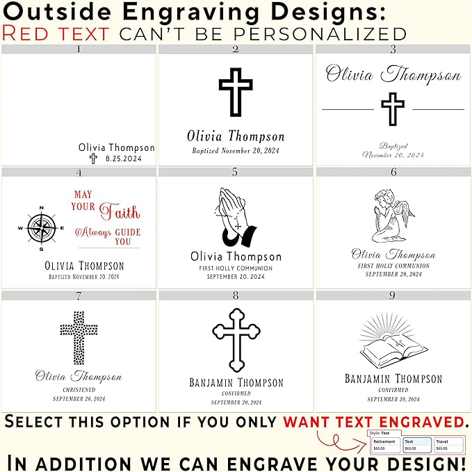 • Customizable: Personalize your first communion box with a name and date. Each design can be changed to "Baptized", "Christened," "Confirmed," "First Communion," etc. or removed entirely if indicated. We’ll use the font style showcased in the photos. The inside lid can also be engraved with your text(different font options). Create a unique and meaningful gift!