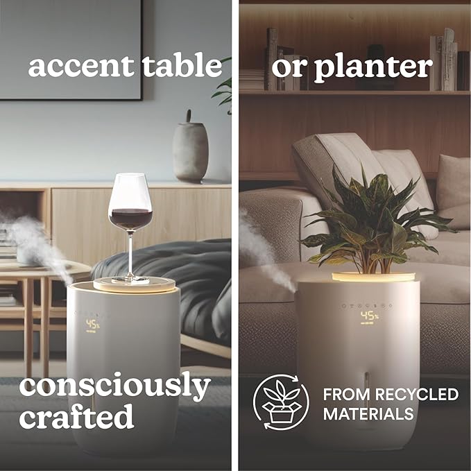 • Style + Substance: The sleek, modern design effortlessly blends into any decor with smooth surfaces and a touchscreen interface, and is consciously crafted with recycled materials. The tabletop can be removed so the humidifier can be used with your favorite 6โ€ small plant.