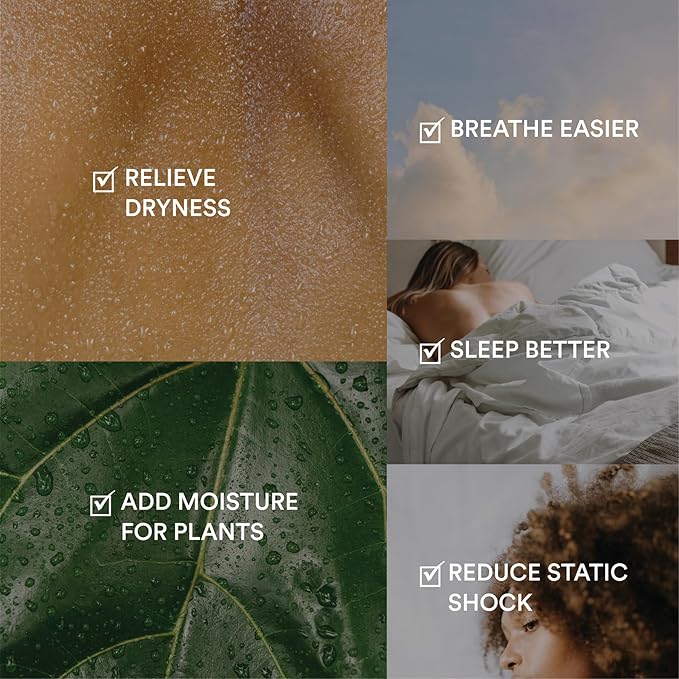 • Breathe in the Benefits: Relieve dryness, breathe better, sleep better, keep hair, skin, and houseplants happy.