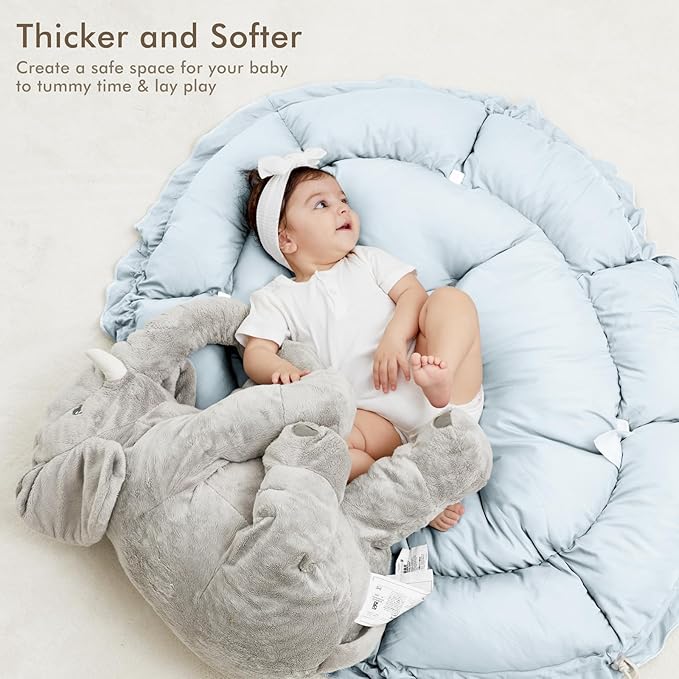 • THICKER & SOFTER: The reversible play mat crafted from premium plush material, offers a fantastic amount of cushion. Its neutral color scheme blends in with your homeโ€™s aesthetic so you can keep it out even after playtime is over.