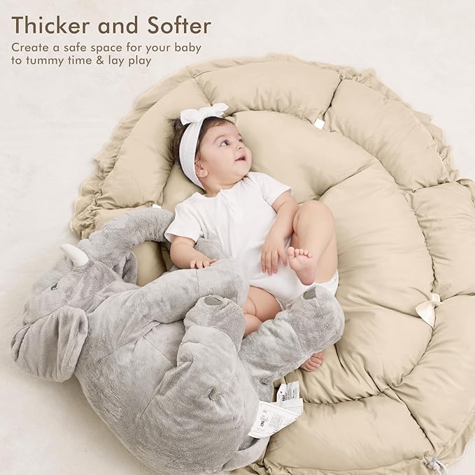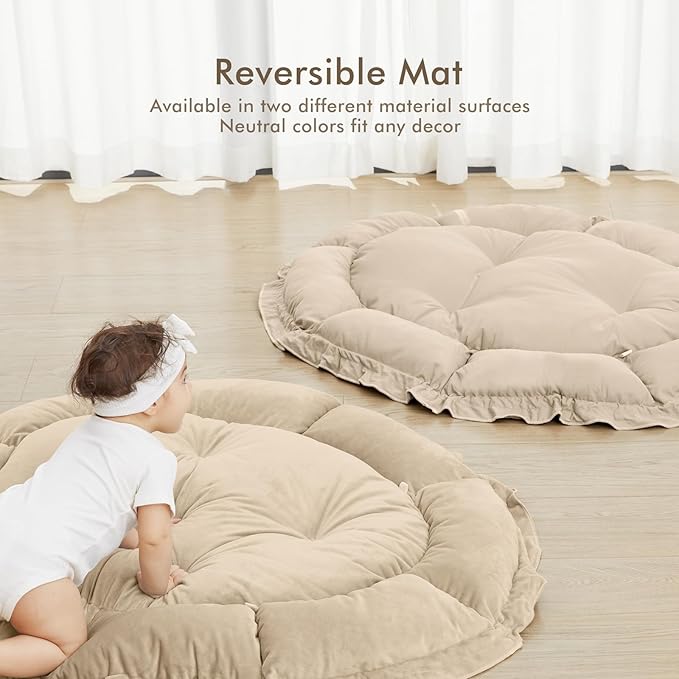 • THICKER & SOFTER: The reversible play mat crafted from premium plush material, offers a fantastic amount of cushion. Its neutral color scheme blends in with your homeโ€™s aesthetic so you can keep it out even after playtime is over.