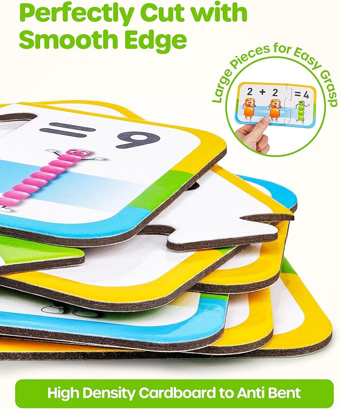 • Kindergarten Math Manipulatives Kit: 30 colorful 2-pieces puzzles pairs: 10 addition pairs, 10 subtraction pairs, and 10 number puzzle pairs, made of sturdy and thickened cardboard that can withstand repeated use. Perfect cut with smooth edge, safe for kids to use. Large pieces that are easy for little hands to hold