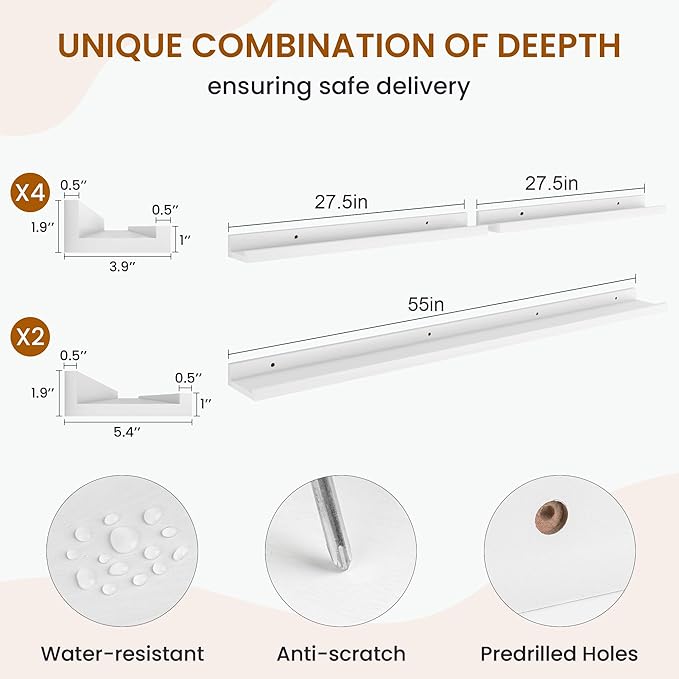 • Ledge Shelf with Lip Protection: Our every picture ledge shelf has a carefully designed front lip, which provides extra protection for your items to prevent them from slipping or falling off. You can rest assured that your favourite books, plants, picture frames, or decorative items are securely in place