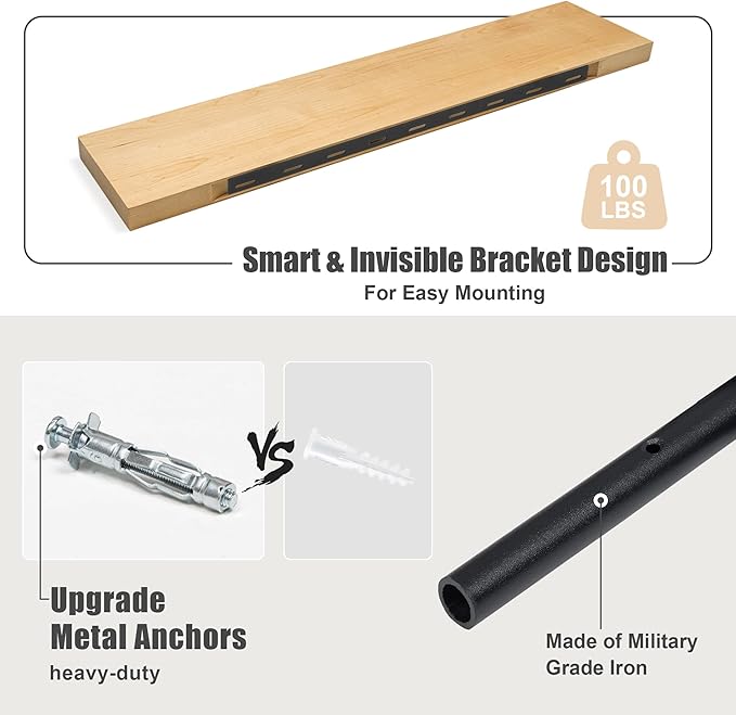 • Sturdy & Functional: Equipped with heavy-duty metal brackets, each shelf supports up to 100 lbs. The flat surface and stable construction make them suitable for any room while showcasing the natural beauty of the wood grain.