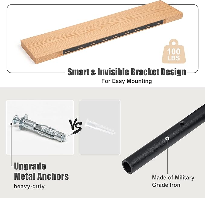 • Sturdy & Functional: Equipped with heavy-duty metal brackets, each shelf supports up to 100 lbs. The flat surface and stable construction make them suitable for any room while showcasing the natural beauty of the wood grain.