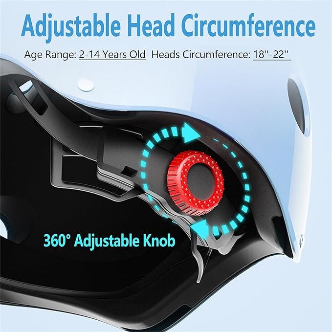 • 🏂️【LIGHTWEIGHT ADJUSTABLE HELMT】Kids bike helmet only weighs 280g, Children helmets have adjustable crank adjustment dial and strap ,and changing the length of the chin strap, maximize the best fit and comfortable wearing, perfectly for boys and girls 2-3-5-8-14 years old. Toddler helmet size: 18'-22',one kids helmet set can be used for a few years.