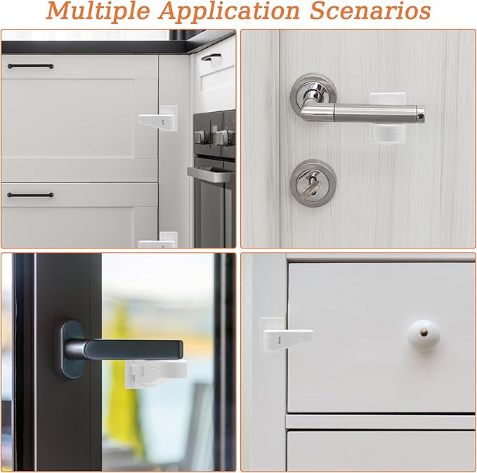 • Easy to install: The door handle lock does not need tools or drilling, simply tear off the adhesive tape and stick the lock onto the door to prevent the handle from being damaged (Please wipe the dust off the cabinet before installation)