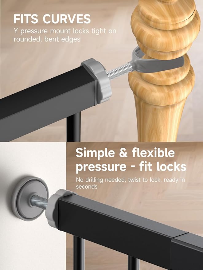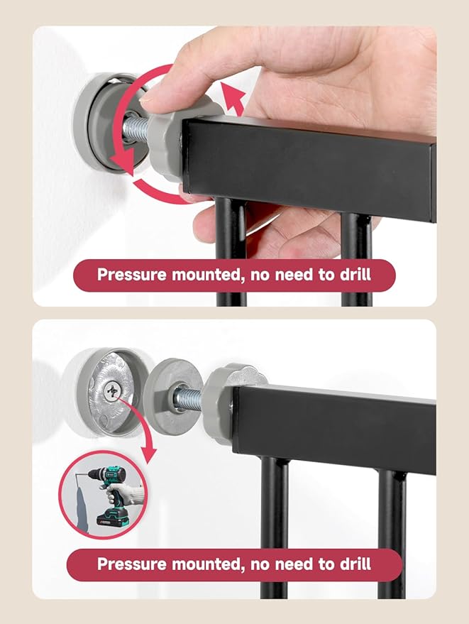 • Keep Your Little Ones and Pets Safe: The extra tall baby gate for stairs is made of all-metal structure, it can withstand impacts from pets. Don't need to worry about baby gates with door being pushed down and hurting your children or dogs. The pet gate is chew-proof, lead-free and non-toxic, providing a secure barrier wherever you need it. Ideal for a family with children and pets