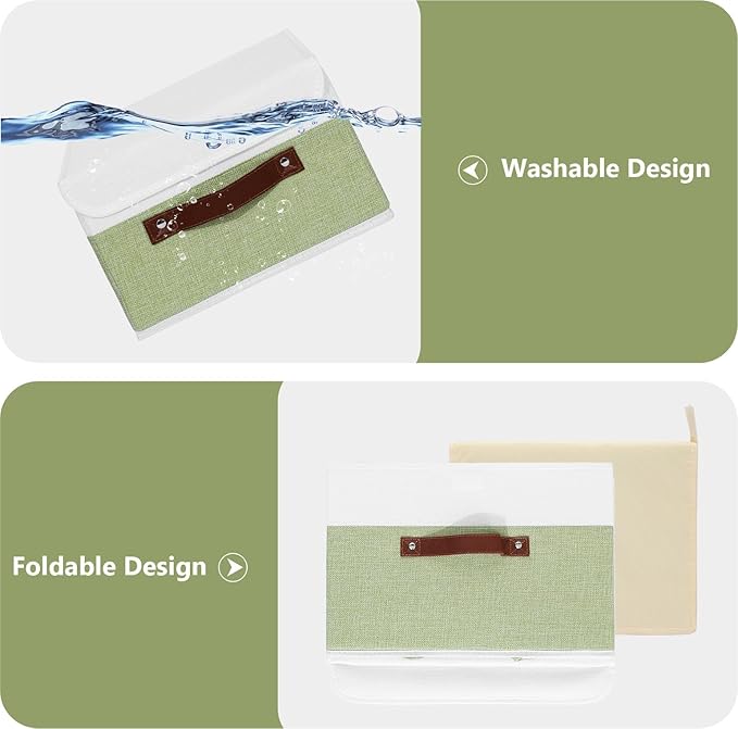 ANMINY 4PCS Storage Boxes with Lid Washable Decorative Storage Bins Basket with PU Leather Handle Foldable Linen Fabric Storage Cubes Containers for Home Closet Organizer - Green White, Small Size