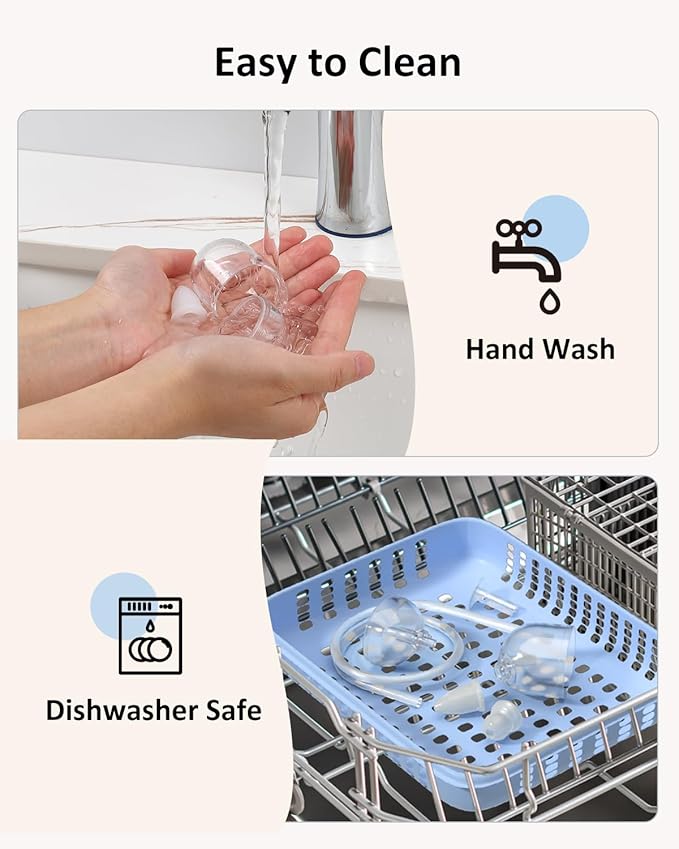 • HASSLE-FREE CLEANING: Experience the convenience of our dishwasher-safe baby nasal aspirator. Designed for effortless maintenance, its transparent suction chamber and tubing detach with ease for a quick rinse under clean water, ensuring hygienic and efficient cleaning every time.