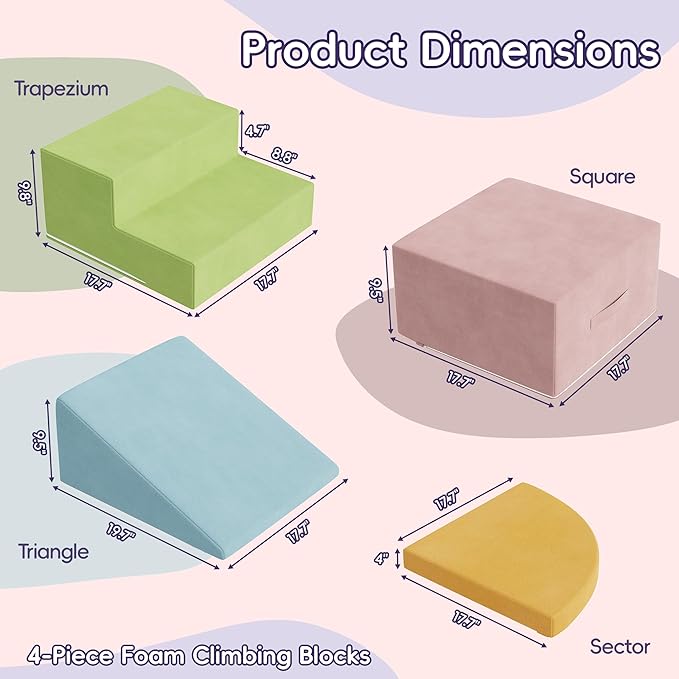 • Safe and Guaranteed: The kids climbing blocks are CPSIA & CPC certified, non-toxic, and tasteless fabric with ASTM approved. Each block is designed with hidden zippers to prevent scratches on delicate skin, and the structure is soft with no sharp edges, reducing the risk of bumps and bruises.